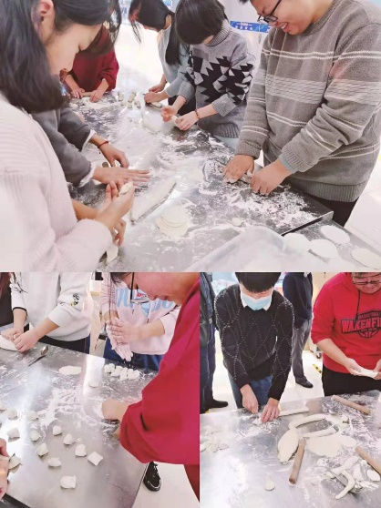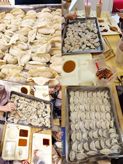 下午四点,同学们齐聚餐厅二楼,大显身手,热情高涨地擀面皮、和馅子、包饺子,一个个奇形怪状的饺子出来了,圆的、长的、尖的、扁的,千奇百怪。在有经验的老师、同学们的指导下,大家逐渐包出了漂亮的饺子,场面十分热闹。在大家的共同努力下,一盘盘热气腾腾的饺子被端上了桌,大家一同品尝劳动的快乐,感受冬至的温暖。