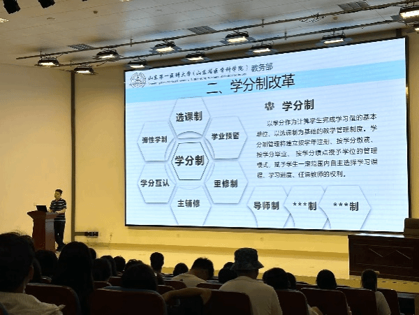8月30日晚,教务部潘少波老师对员工在校期间的教学管理情况进行了介绍,针对教务部管理体制、学分制改革以及同学们关心的选课、学分绩点、重修、转专业等问题进行了重点讲解,并寄语同学们努力学习,脚踏实地,取得优异成绩。