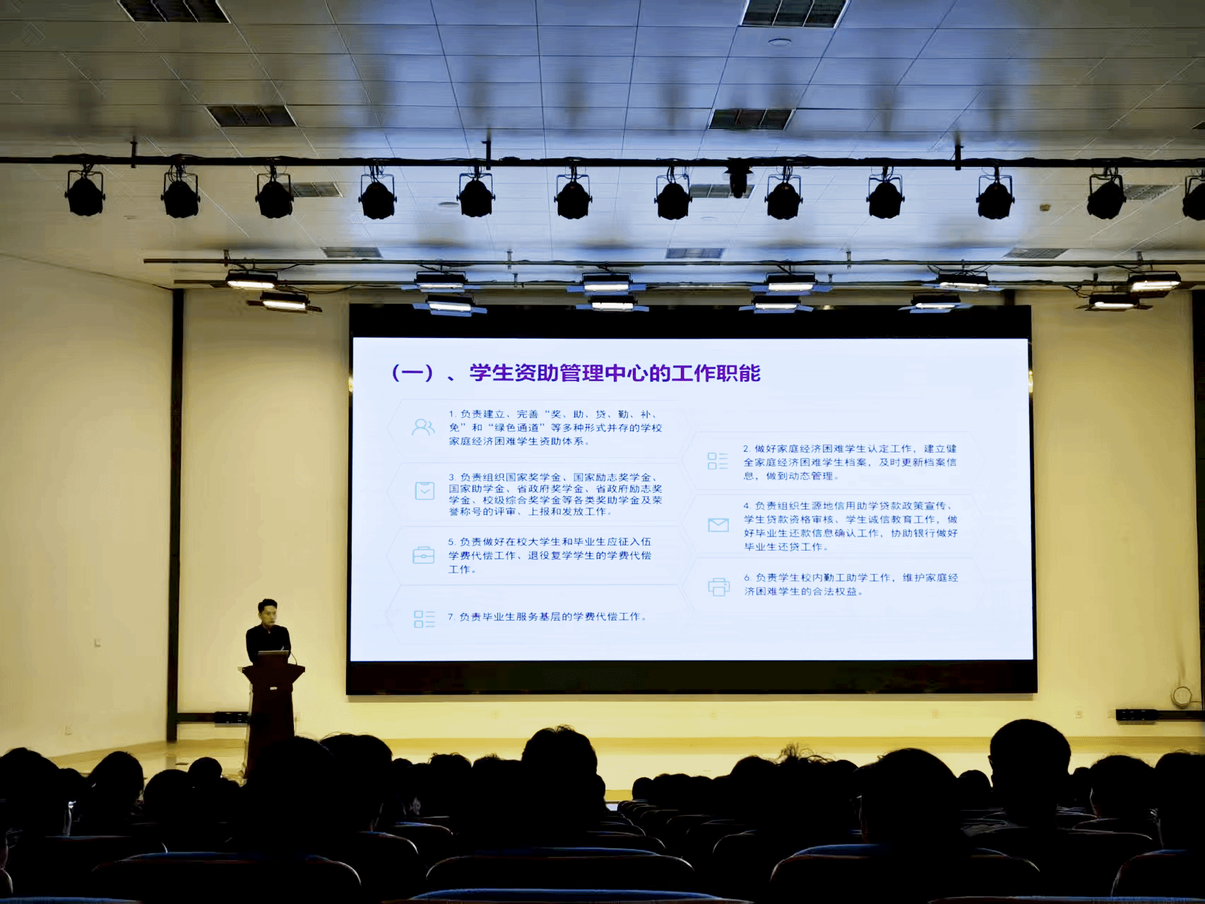 张金斌围绕国家、省级、校级资助体系展开详细讲解,既全面梳理了多元化奖学金制度、国家助学贷款申请细则、资助资格认定流程等 “普惠性”政策,也重点介绍了荣誉表彰、专项补助等“激励性”举措,确保政策覆盖从“入学保障”到“成长支持”的全环节。随后,他进一步聚焦校(院)特色帮扶措施,针对家庭经济困难员工的专项资助体系进行细化说明,并结合实际案例讲解认定工作的具体流程、材料要求及时间节点,让新生对政策落地细节“看得懂、算得清、用得上”。同时,他还向新生发出倡议希望同学们以勤勉笃学的态度投入大学时光,在享受政策保障的同时勇担时代责任,努力成长为有理想、敢担当、能作为的新时代青年。