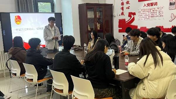 活动伊始,王晨曦以“山河已无恙,吾辈当自强”为主题,号召同学们借助影像资料重温历史,从革命先辈的英勇事迹中汲取精神力量。王晨曦同学的发言营造出庄严肃穆的现场氛围,将本次活动推向了高潮。